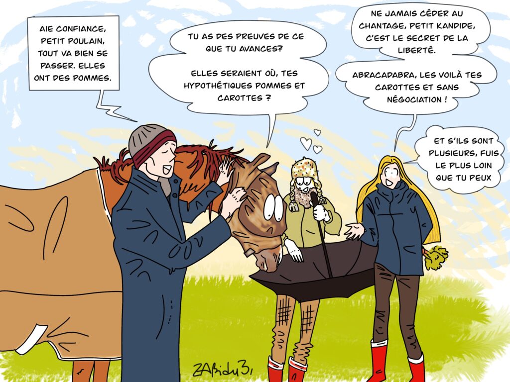 Hier c’était Noël et ils sont arrivés en grande délégation avec un parapluie. Pas que j’en aie peur mais en voyant arriver la brochette de mammifères hirsutes et bien décidés à l’abordage, je me suis posé des questions. Leur dessein était de me présenter le parapluie fermé et ouvert, alors pour ne pas les décevoir et leur donner l’impression qu’ils domptent un peu la bête, mais aussi pour les faire courir un peu, j’ai fait mine d’avoir peur et je me suis carapaté ; c’est bon pour leur santé : après la dinde de Noël et les agapes. Ils m’amusent avec leurs singeries, leurs mimiques pour me rassurer sur un objet que je connais depuis ma naissance. Cela dit, Je les aime bien quand même et j’aime encore plus leurs friandises.